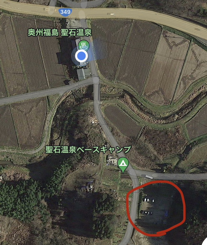 聖石温泉入口から橋を渡りキャンプ場に向かうとキャンプ場兼駐車場がございます。